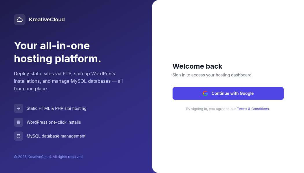 A complete self-hosted web hosting platform with FTP management, MySQL databases, PHP support, and one-click WordPress deployment.